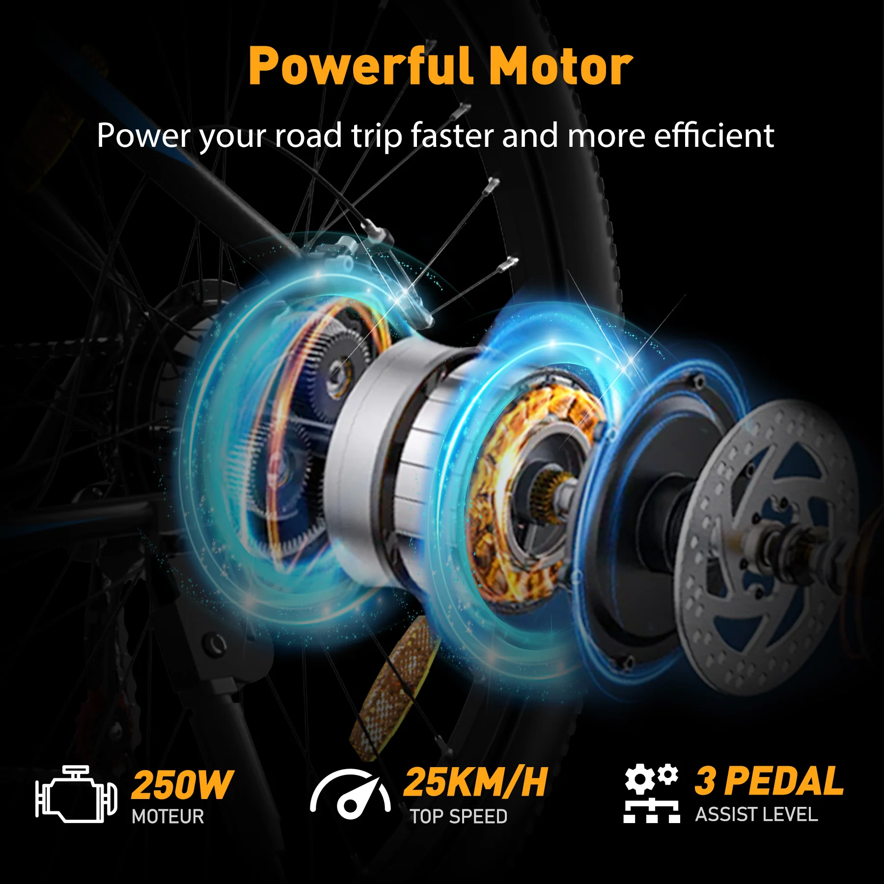The electric bicycle is equipped with a dual-disc brake system, which can effectively shorten the braking distance. High-brightness headlights and rear reflectors provide you with excellent visibility and effectively ensure your safety when driving at night.